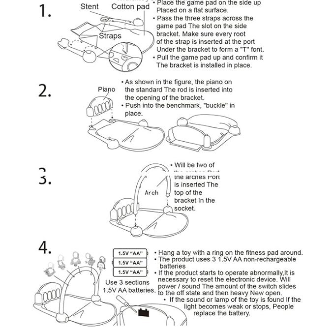 - Sensory Stimulation: Features music, lighting, and a 4-key piano with lights on the feet, allowing the child to enjoy music by pressing with their feet and strengthening their leg muscles. The gym is 100% safe and non-toxic for your child, suitable for babies from birth to 36 months old.
