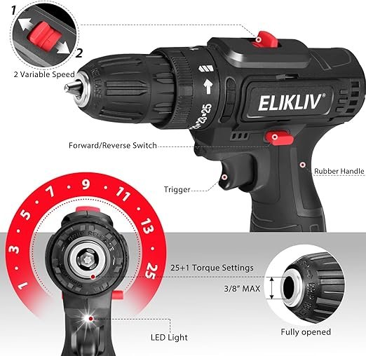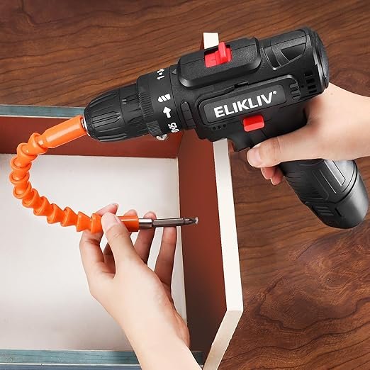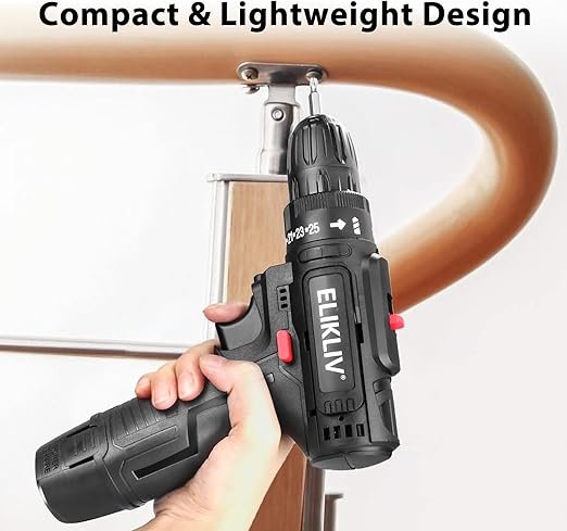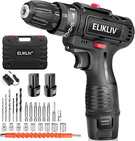 Buy the ELIKLIV 12V Cordless Drill with 10mm keyless chuck, 2-speed control, LED light, and 2 x 1.5 Ah batteries. Perfect for wood, cement, ceiling, and brick drilling.