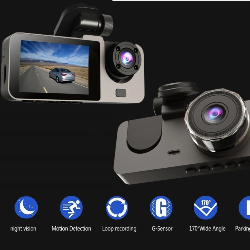 Buy the best Triple Channel Dash Cam with front, inside & rear 1080P recording, WiFi app control, parking mode, wide angle, G-sensor, and waterproof rear camera. Perfect for cars, taxis & rideshare drivers.