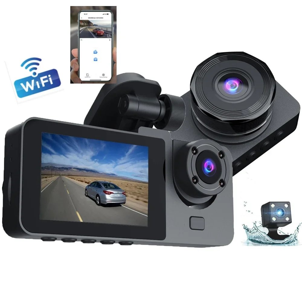 Triple Channel Dash Cam 1080P – Front, Inside & Rear Recording | WiFi & Parking Mode