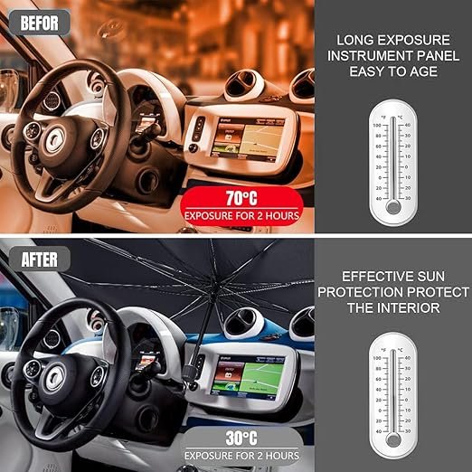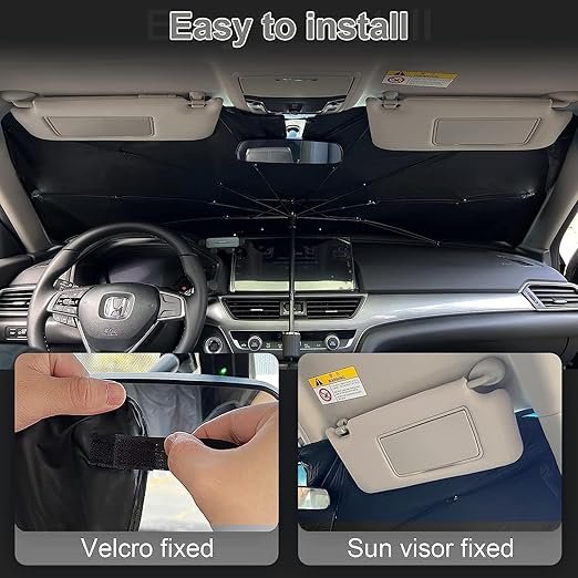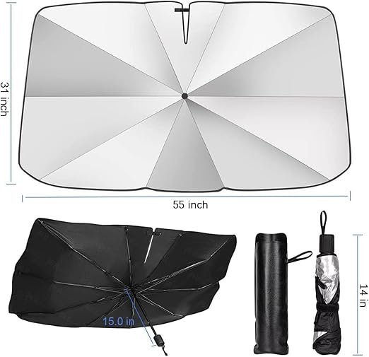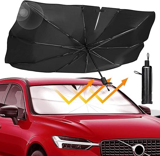 Buy the ULHYC Car Windshield Sun Shade Umbrella with UPF50+ UV protection and an upgraded umbrella-style design. Foldable, compact, and fits most vehicles.